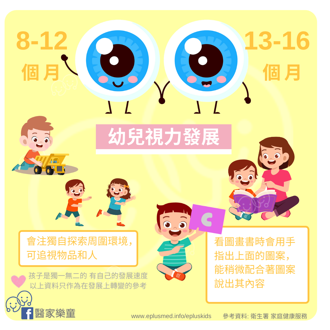 8至12個月大的嬰兒活動能力開始增加,寶寶開始獨自探索周圍環境,可追視物品和人;13到16個月大時,看圖畫書時會用手指出上面的圖案,也可能稍微會配合著圖案說出其內容;但一般要兩歲時模仿畫圖才會畫的比較好。在這階段寶寶已能漸漸掌握手眼協調、立體視覺、視覺認知和視覺記憶等較高階的能力。幼兒在學習走路、自理和把玩各種玩具的時候,已懂得利用眼睛看到的影像而協調全身各組肌肉活動。