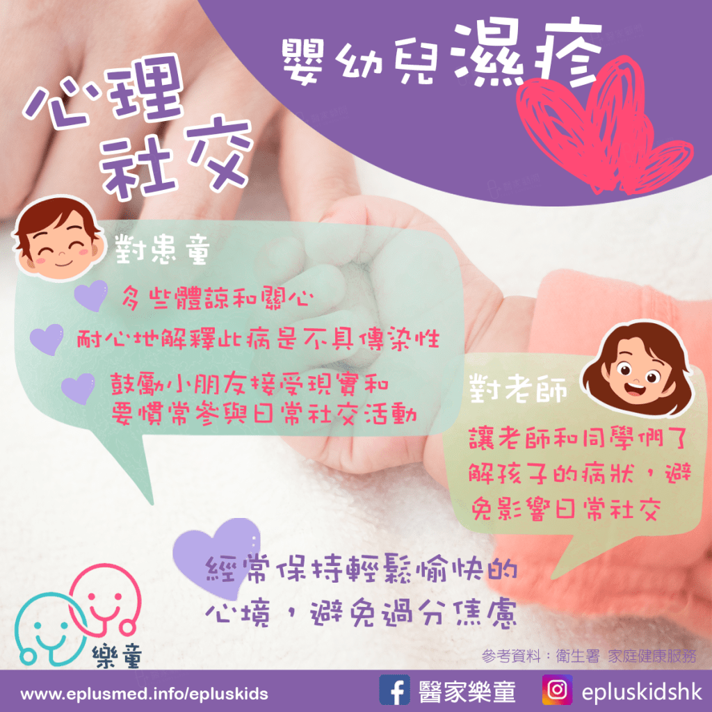 父母對病童要多些體諒和關心 ,應鼓勵小朋友接受現實和慣常參與日常社交活動。也可耐心地向小朋友解釋濕疹是不具傳染性 的,不應懼怕接觸他人。家長亦可預先向老師 解釋,讓老師和同學們了解孩子的病狀,避免影響日常社交。