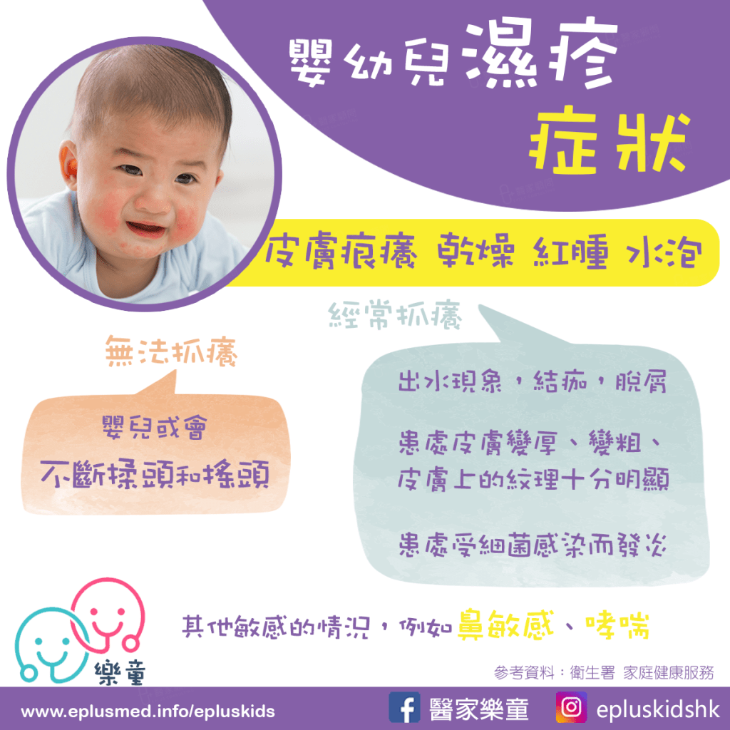 嬰幼兒濕疹多數在小朋友二至三個月大時出現,一般約兩歲會逐漸康復,但少部份患者會持續至成年。濕疹通常由面部開始,然後兩邊手肘及膝蓋都可能出現症狀。皮膚會變紅及乾燥,有時會形成一些小水泡。小朋友會感到皮膚痕癢至難以入睡,甚至有灼熱的感覺。如果有這些情況,家長需要帶小朋友看醫生。