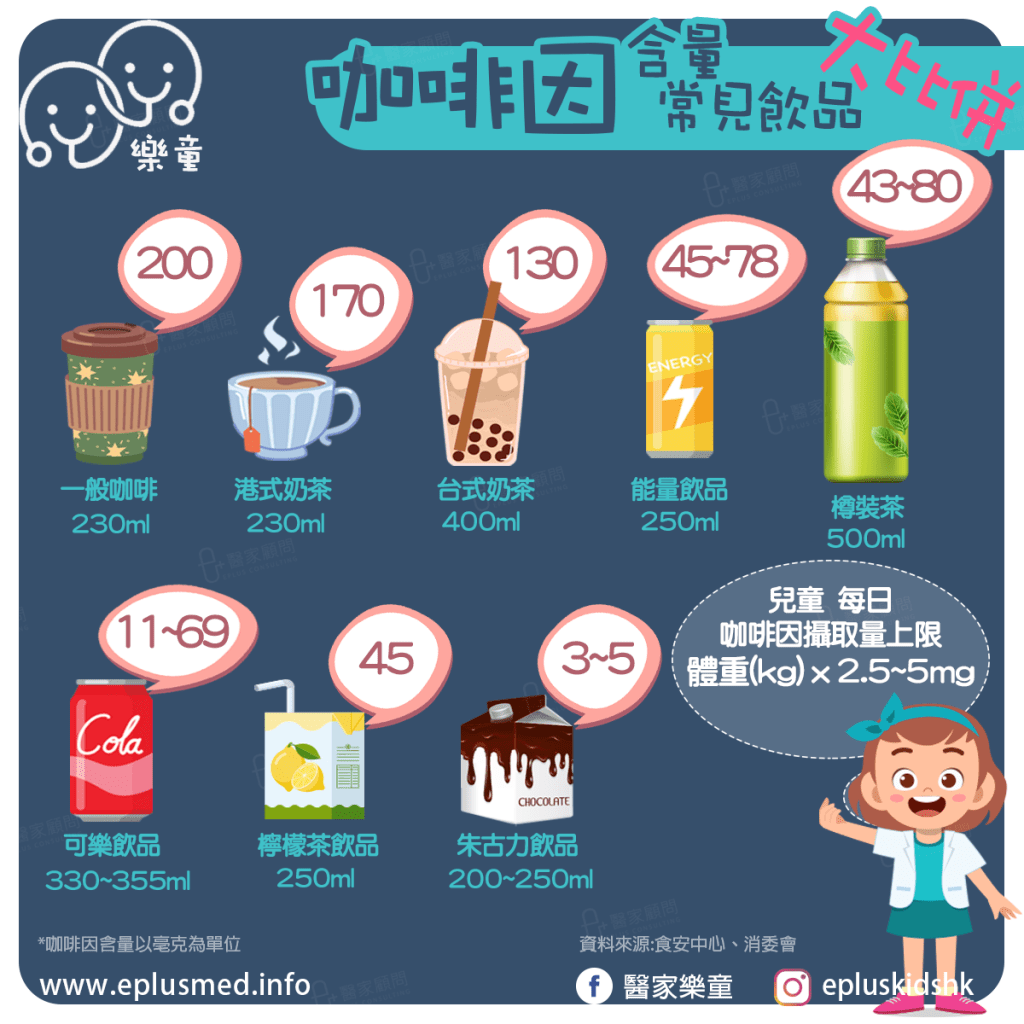 相信大家都知道咖啡裡面有咖啡因,不過,原來可樂、朱古力、茶類飲品等都隱藏著咖啡因的,小朋友太早攝取過多咖啡因有機會對腦部發展造成不良影響。