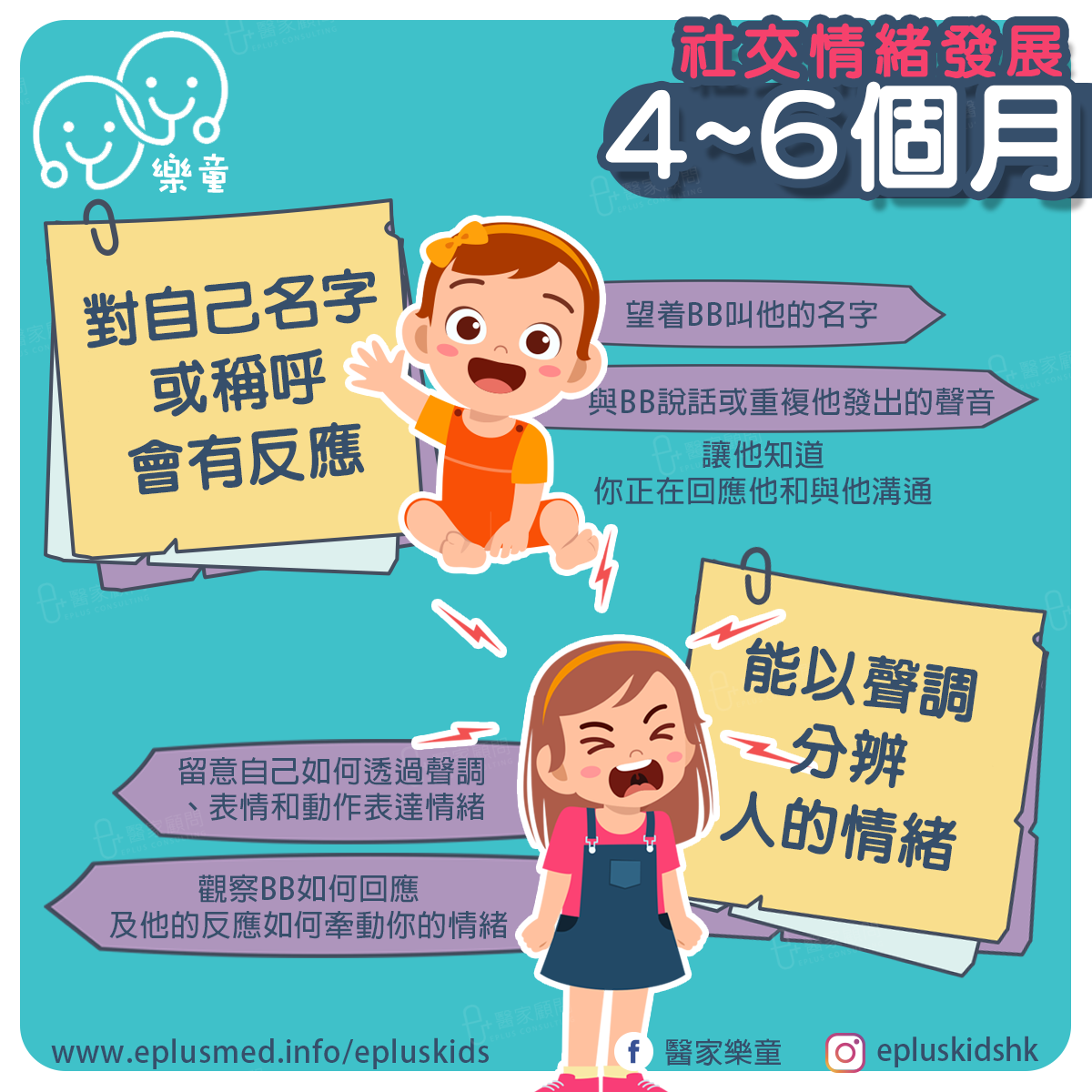 在這階段BB對自己名字或常用稱呼會有反應,家人可多叫BB的名字,讓他知道你正在與他溝通。