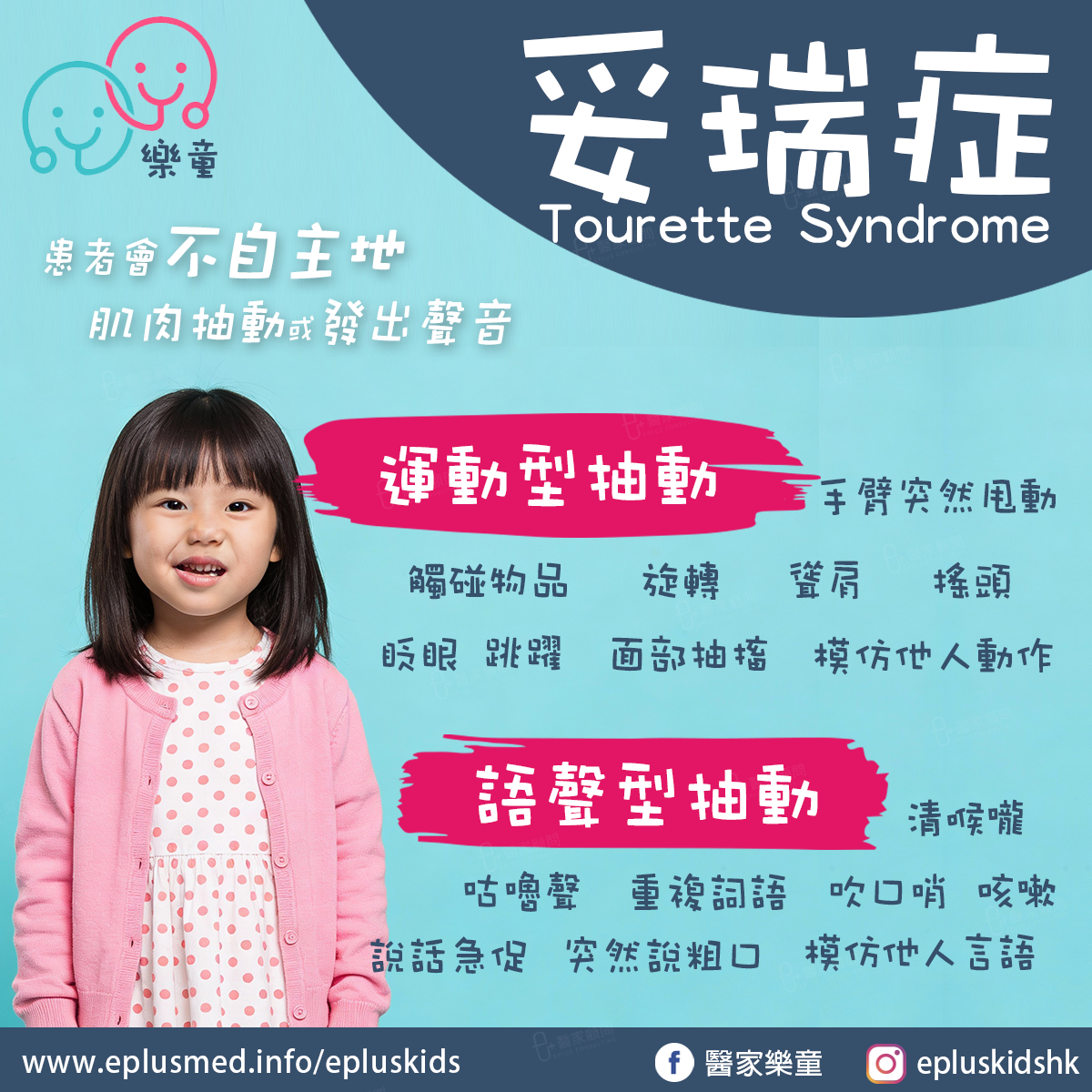 患者無法控制身體突然、快速、重複且不自主的抽動行為,這些抽動包括運動型和語聲型,如眨眼、聳肩、清喉嚨等。