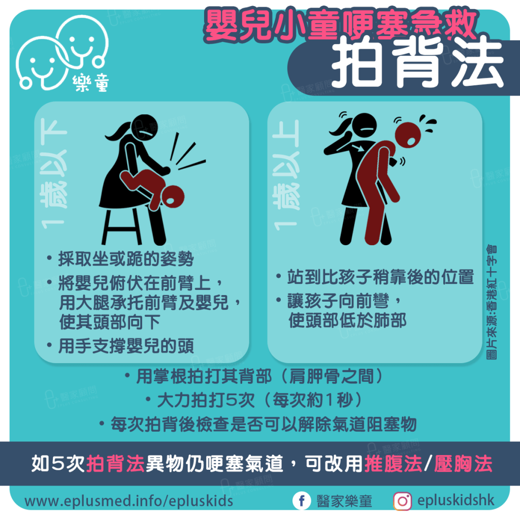 「拍背法」目的是通過衝擊/拍打減輕阻塞,不是一定要做滿5次。如果5次「拍背法」不能迫出阻塞物,可改用5次「壓胸法」(Chest Thrusts),最多5次。