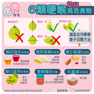 較常引起哽塞的食物包括:葡萄丶花生、硬糖丶棉花糖和蒟蒻啫喱等。