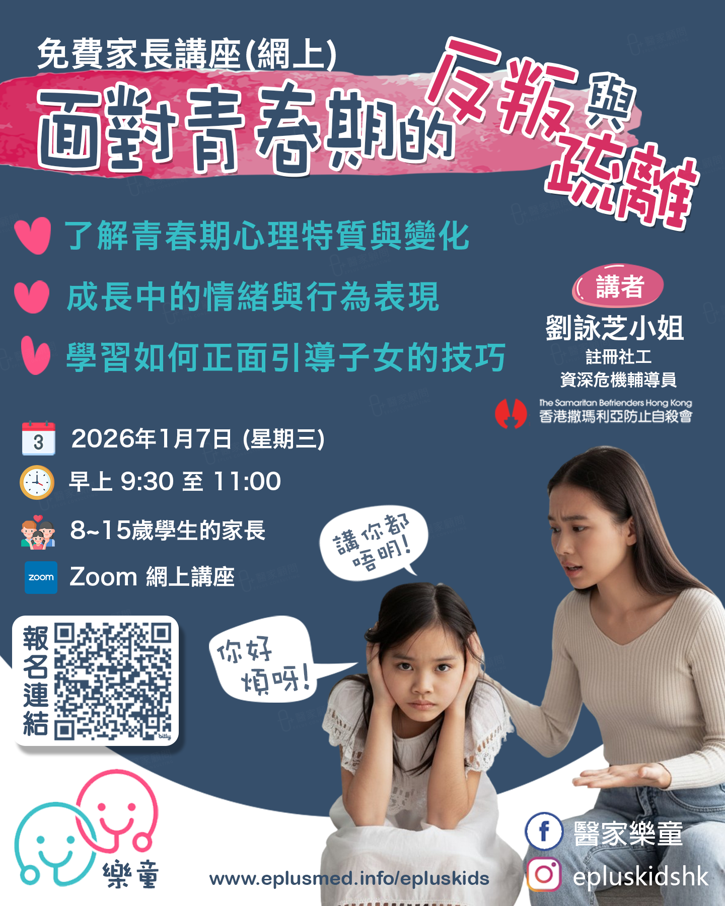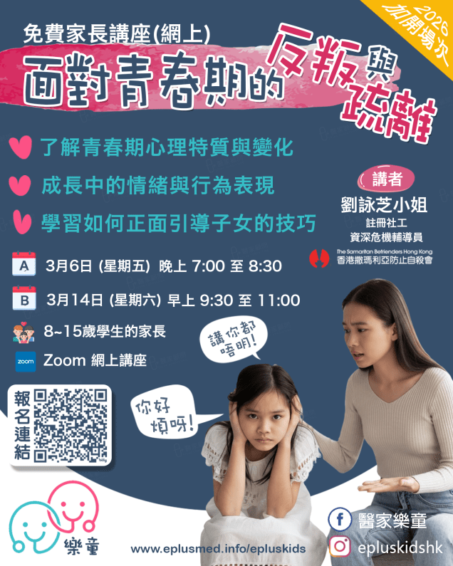 醫家樂童聯同香港撒瑪利亞防止自殺會合辦,邀請資深社工劉詠芝姑娘分享青春期心理與情緒變化,以及實用的正向引導技巧,減少親子衝突,提升孩子的情緒支持與安全感。