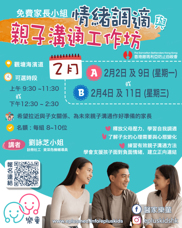 醫家樂童特別聯同香港撒瑪利亞防止自殺會,邀請資深社工及輔導員劉詠芝小姐,舉辦免費家長小組。