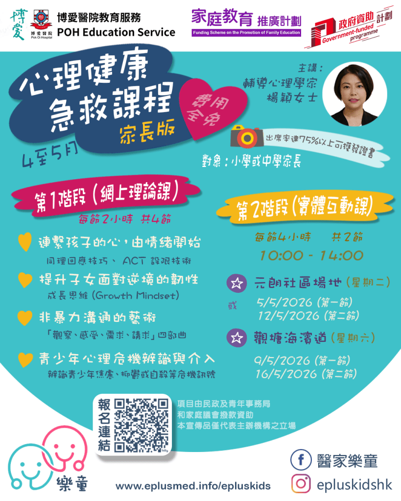由註冊輔導心理學家及資深心理急救培訓師主理,結合「線上自學」與「實體互動」兩個部分,讓家長先在平台上學習心理急救的基礎概念,再透過實體課堂進行討論、角色扮演與實況演練,務實掌握與子女溝通、辨識情緒變化及適時介入的技巧。