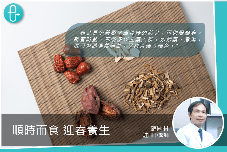 傳統有云:「春天宜食韭」。韭菜是少數屬辛溫性味的蔬菜,在春天時品質最佳。其溫性可助陽驅寒,其不太濃烈的辛味亦正配合春天「升發」的特性。新春時節,不妨多以韭菜入饌,如炒菜、煮湯,既可幫助溫養陽氣,又符合時令特色。