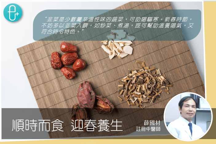 傳統有云:「春天宜食韭」。韭菜是少數屬辛溫性味的蔬菜,在春天時品質最佳。其溫性可助陽驅寒,其不太濃烈的辛味亦正配合春天「升發」的特性。新春時節,不妨多以韭菜入饌,如炒菜、煮湯,既可幫助溫養陽氣,又符合時令特色。