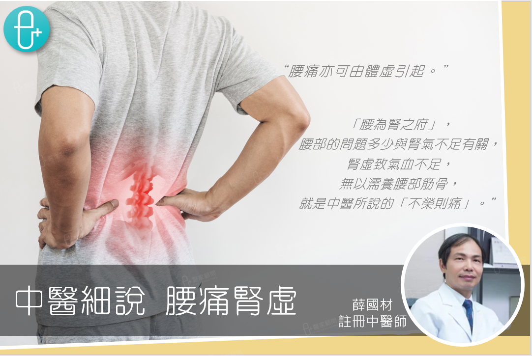 腰痛亦可由體虛引起。「腰為腎之府」,腰部的問題多多少少亦和腎氣不足有關,腎虛致氣血不足,無以濡養腰部筋骨,就是中醫所說的「不榮則痛」。