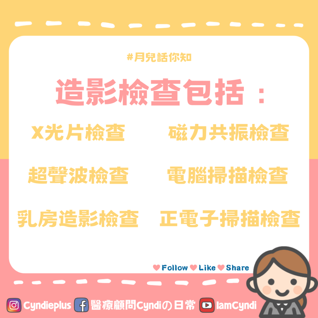 X光片、超聲波、電腦掃描、磁力共振、正電子掃描