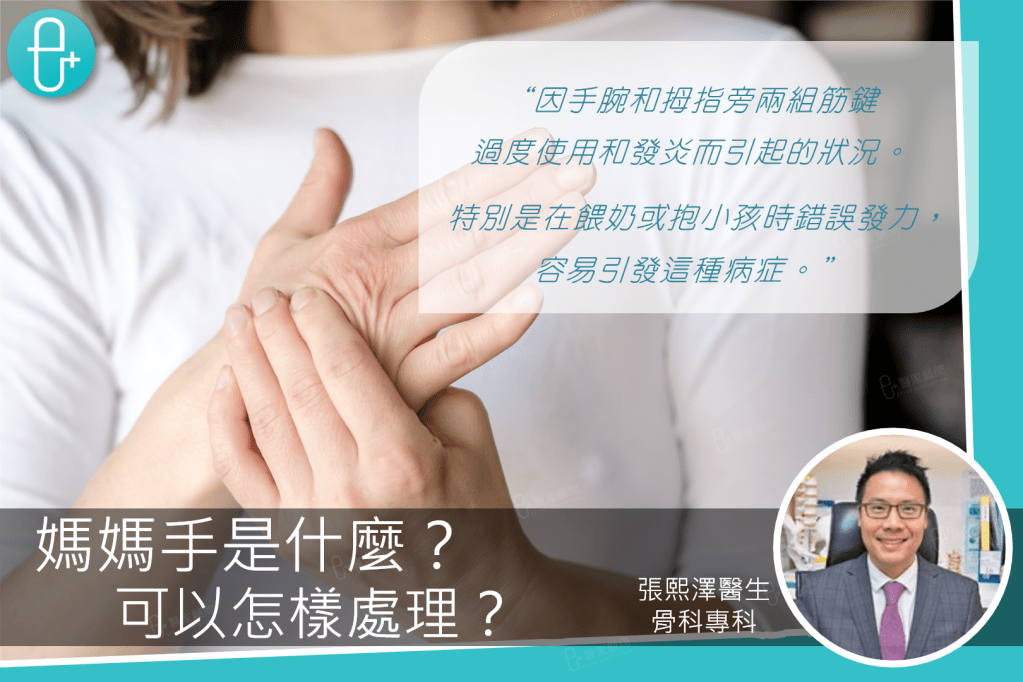其中,有一種常見於媽媽及育兒家長中的疾病叫作「媽媽手」,醫學上正式名稱為 – 狹窄性腱鞘炎(De Quervain’s disease)。這是一種因手腕和拇指旁兩組筋鍵過度使用和發炎而引起的狀況。特別是在餵奶或抱小孩時錯誤發力,容易引發這種病症。值得注意的是,這病症不僅僅只影響女性,職業司機、地盤工人等職業,因經常重複使用拇指和手腕的人群,亦有可能會患上「媽媽手」。