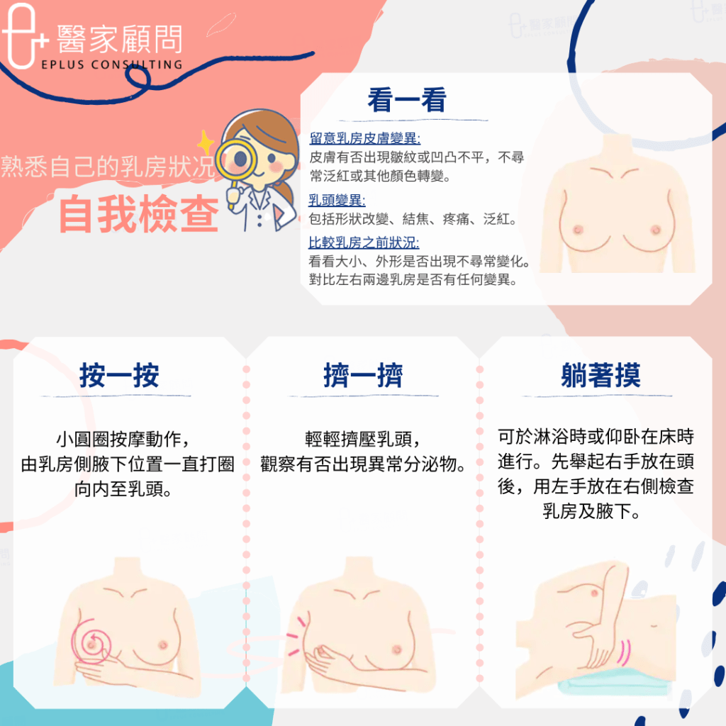每月進行自我乳房檢查及定期進行婦科檢查,有助及早發現早期乳癌的危險訊息。