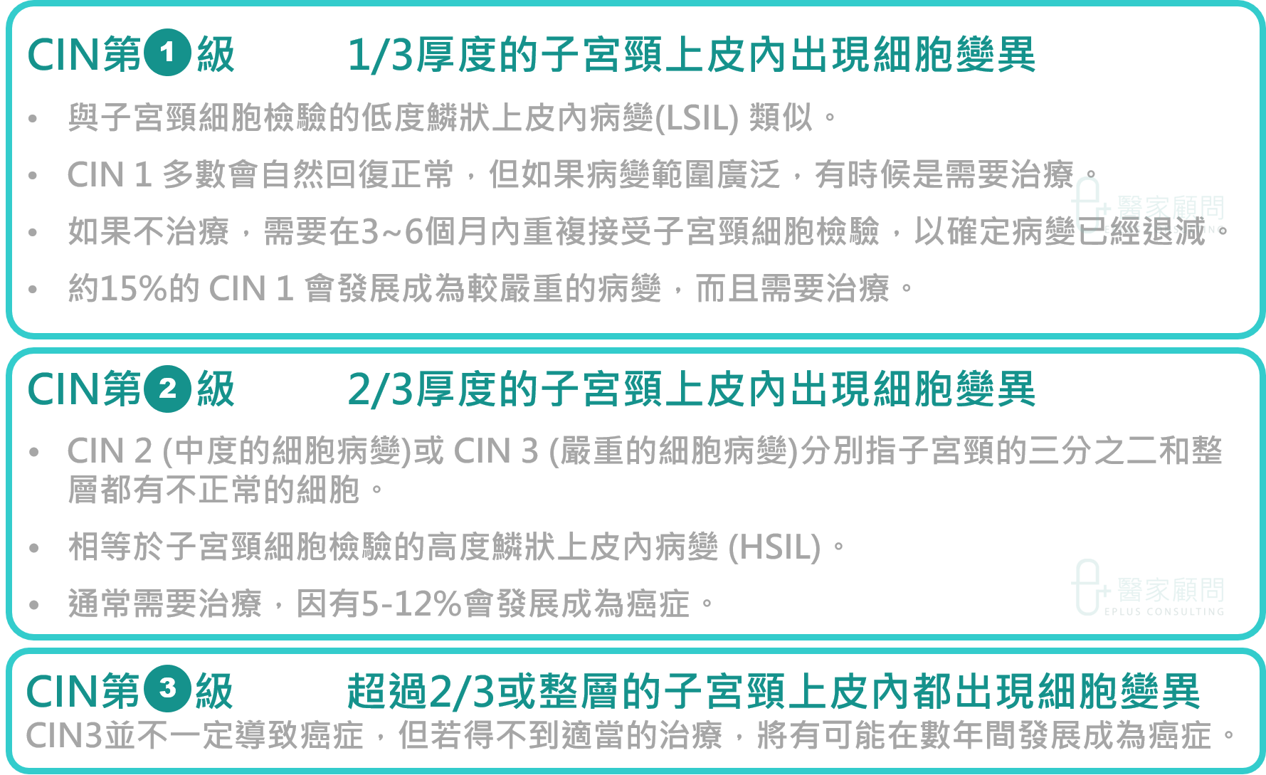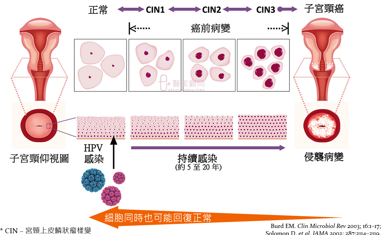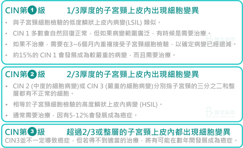 ► CIN並不是癌症而是一種癌前的變化狀態,通常是由持續感染HPV引致的。