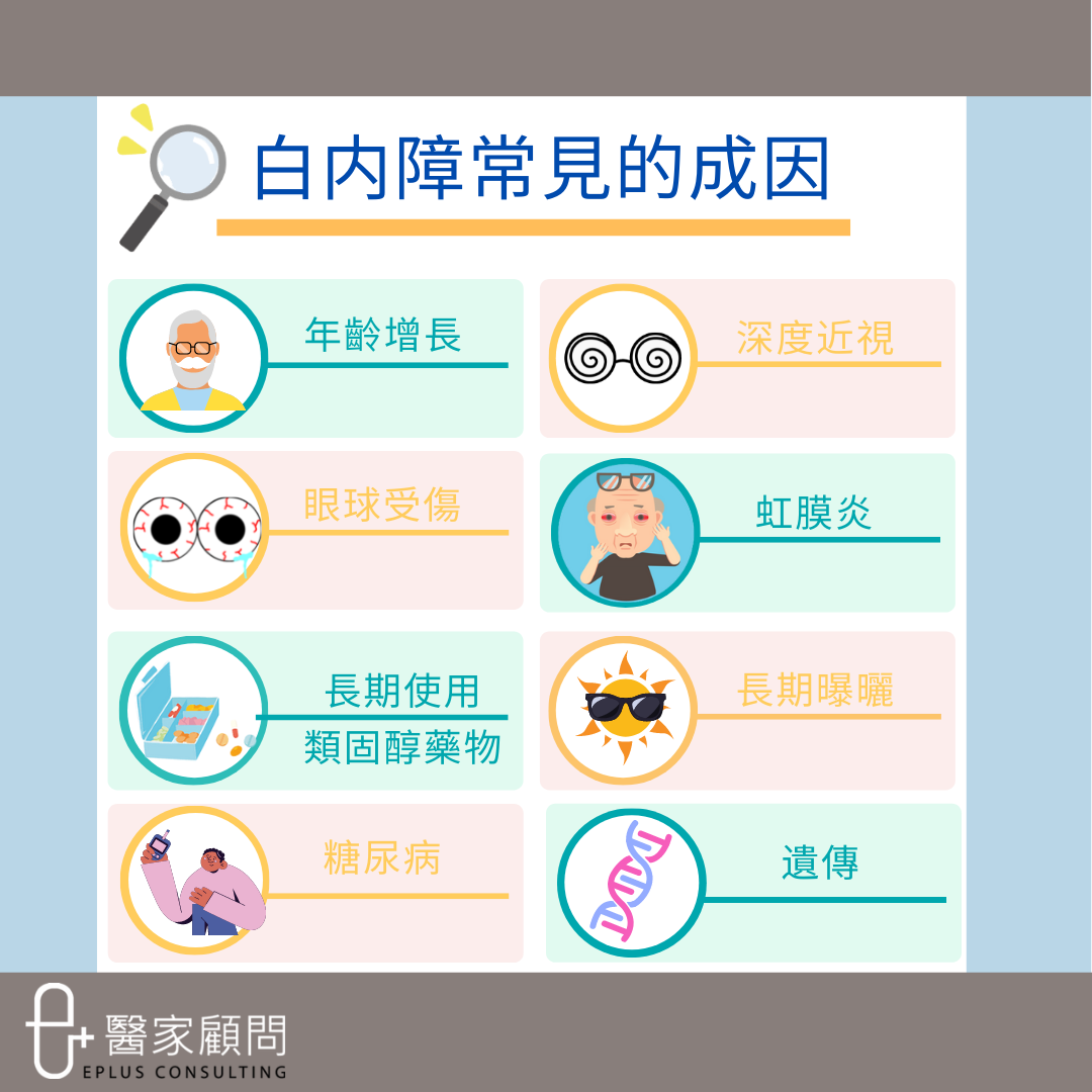 白內障的成因分有很多種,除少數先天因素外,大多是因為後天因素所致,大多數均出現在較年長的人士身上。