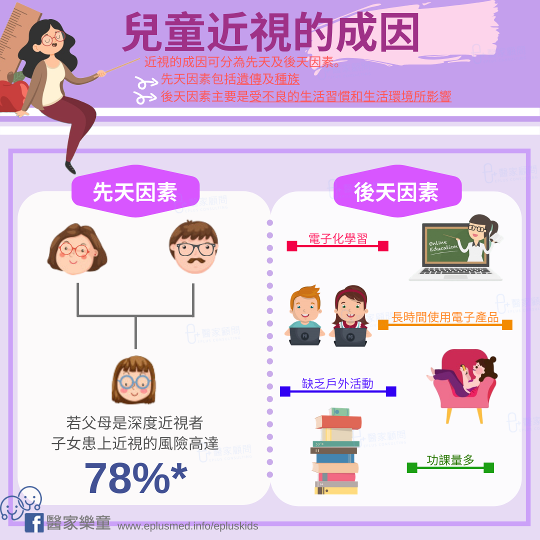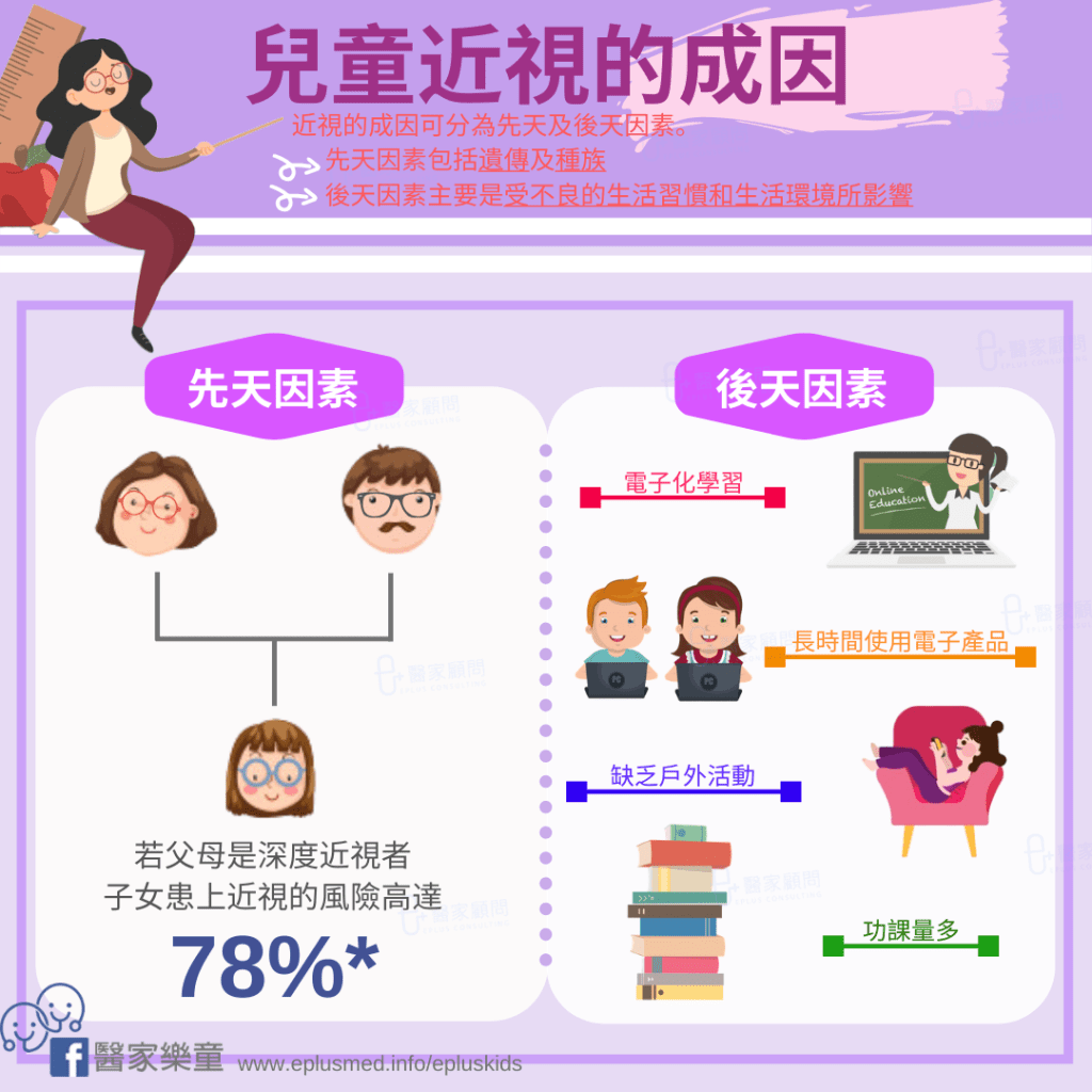 近視的成因一般為眼球過長,令影像聚焦於視網膜的前面。有近視的兒童,看遠景時影像比看近物時模糊,上課看黑板可能有困難,看遠方景物時更可能要瞇起雙眼。