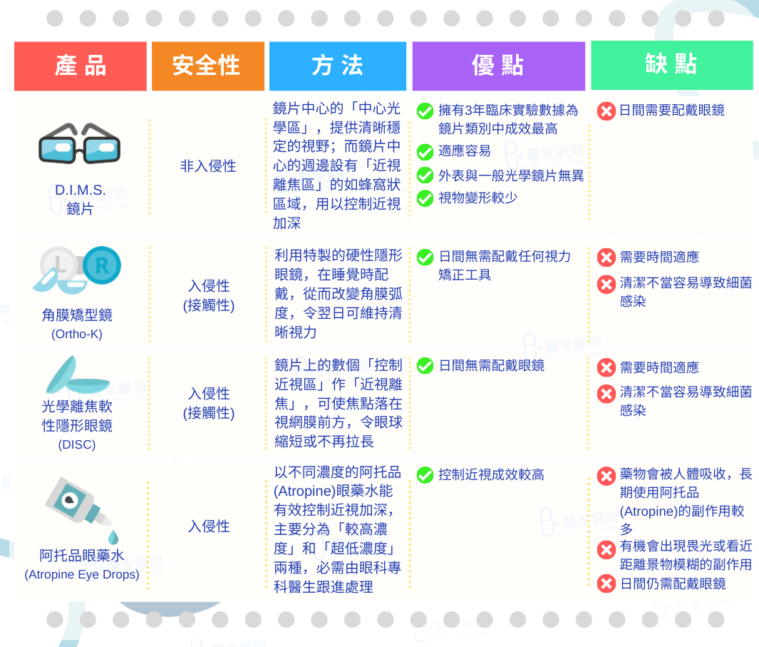 - 配戴一般眼鏡能矯正視力,但沒有減慢近視加深的作用,亦不能減低日後因深近視而有的眼疾風險。雖然近視不能治好,但可透過不同方法控制其加深速度。