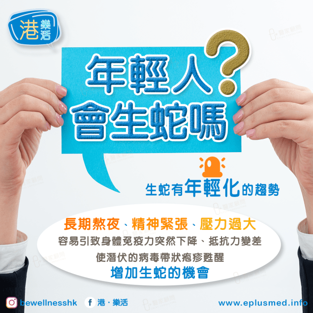 近年來,生蛇亦有年輕化的趨勢:主要因為年輕人長期熬夜、精神緊張、壓力過大,容易引致身體免疫力突然下降、抵抗力變差,可能使潛伏的病毒帶狀疱疹甦醒,增加生蛇的機會。
