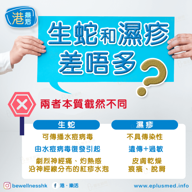 生蛇和濕疹完全不一樣的。濕疹是不具傳染性的皮膚反應疾病,主要是因為遺傳和過敏反應造成;而生蛇是過濾性病毒,感染水痘後潛伏身體,伺機發病。兩者在本質和病徵上都有着相當大的分別。生蛇的痛楚通常比濕疹嚴重,會出現灼熱、刺痛等神經痛。