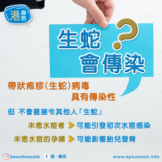 帶狀疱疹病毒(生蛇)的確具傳染性,但不會令其他人生蛇。即使直接接觸到生蛇患者的水泡,病毒只會令沒有患過水痘的人生水痘,但不會令新感染者直接生蛇。所以孕婦和未出過水痘的人士應避免接觸患者,因為胎兒和未出過水痘的人士,會有機會受感染,影響胎兒發育及生水痘。