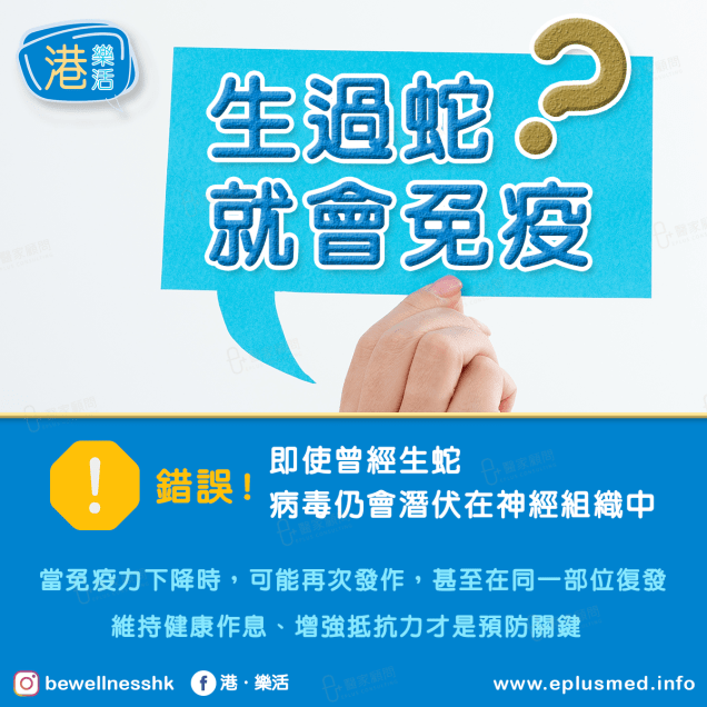 雖然生蛇的確難以避免,而且目前沒有100%預防生蛇的方法。不過,其實不論長者還是年輕人,只要保持心境開朗,充足睡眠,多做運動,維持免疫系統的健全,就可以大幅減少生蛇的機會。所以保持身心健康,也是預防生蛇的一個方法。