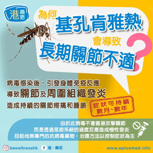 基孔肯雅熱會導致長期關節不適,主要原因是病毒感染後引發身體免疫反應,導致關節及周圍組織發炎,造成持續的關節疼痛和腫脹,症狀可能持續數月甚至數年。由於基孔肯雅病毒本身不會直接攻擊關節,而是透過免疫系統的過度反應造成慢性發炎,目前尚無專門的抗病毒藥物,治療方法以控制症狀為主。