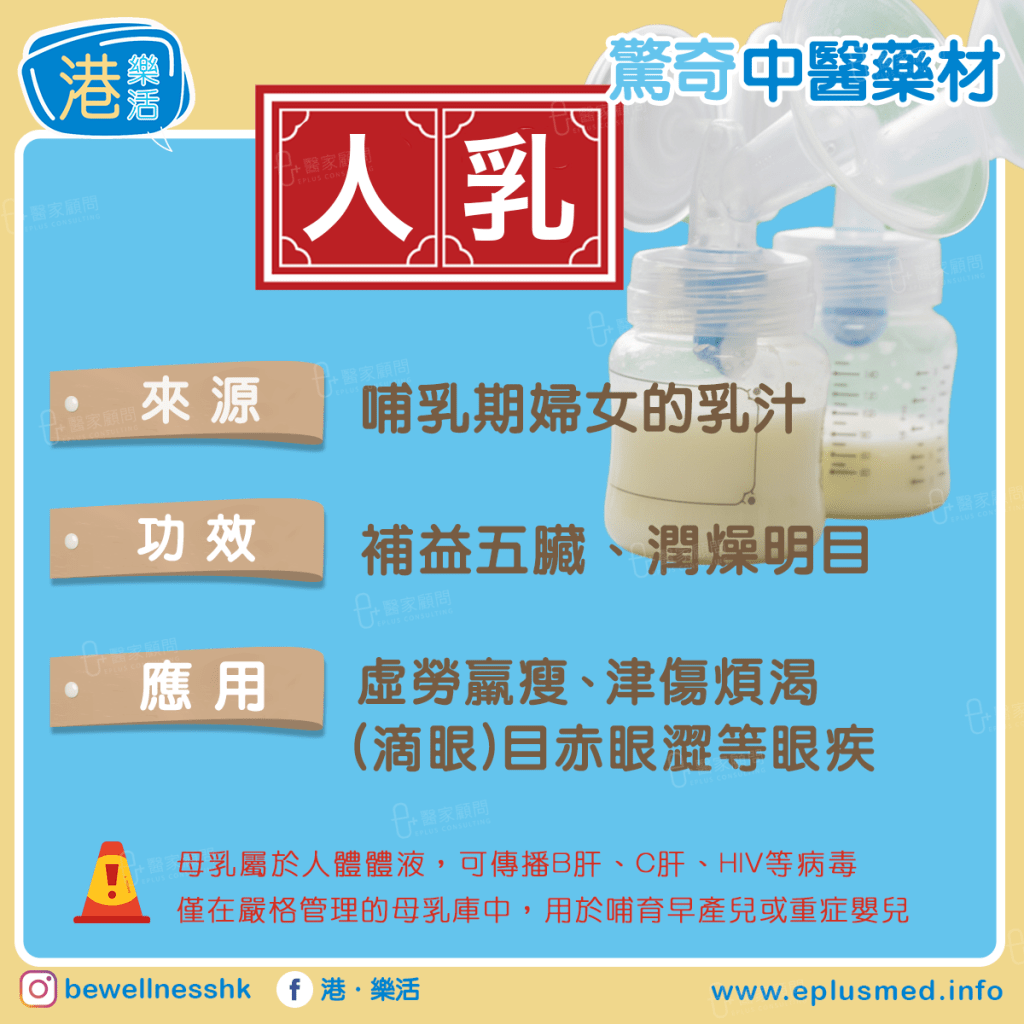 中醫所用人乳須新鮮、來自哺乳期健康婦女的乳汁,性甘、溫,有珍貴滋養作用。