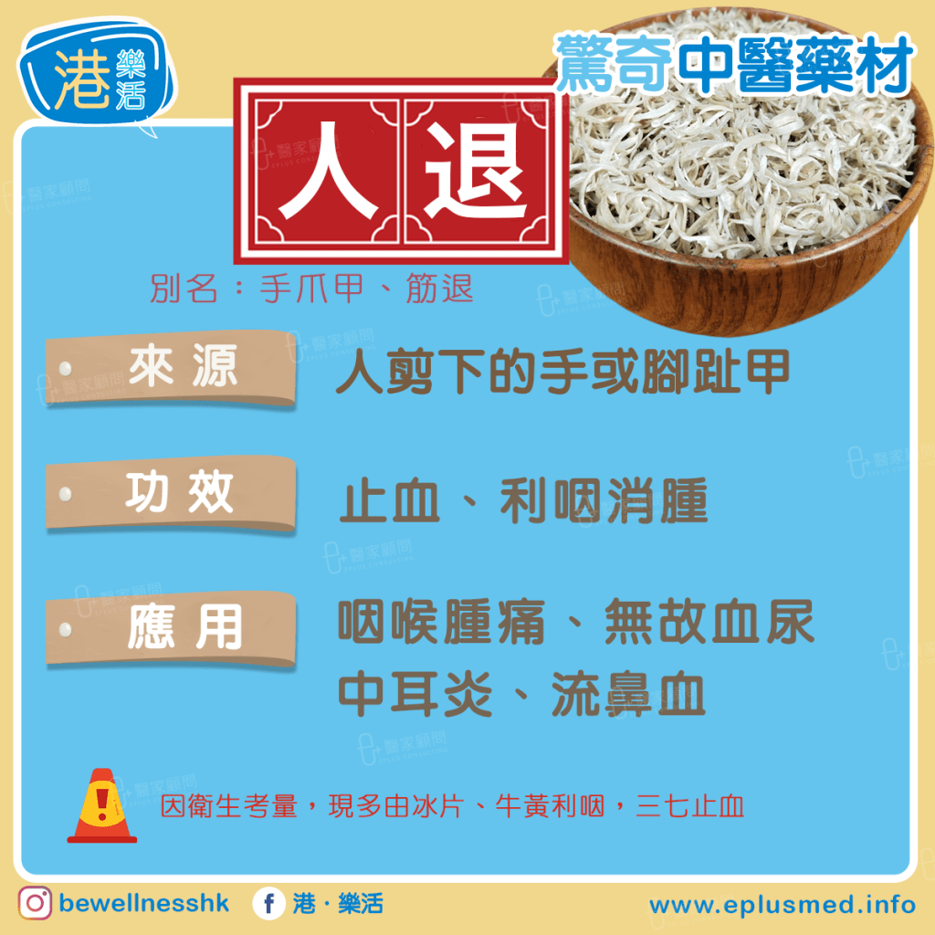 「人退」是中醫藥中用途獨特的一味藥材,其實即是健康人剪下來的指甲,具有止血、清熱和治療多種疾病的功效,並在歷代醫書中有多項記載。