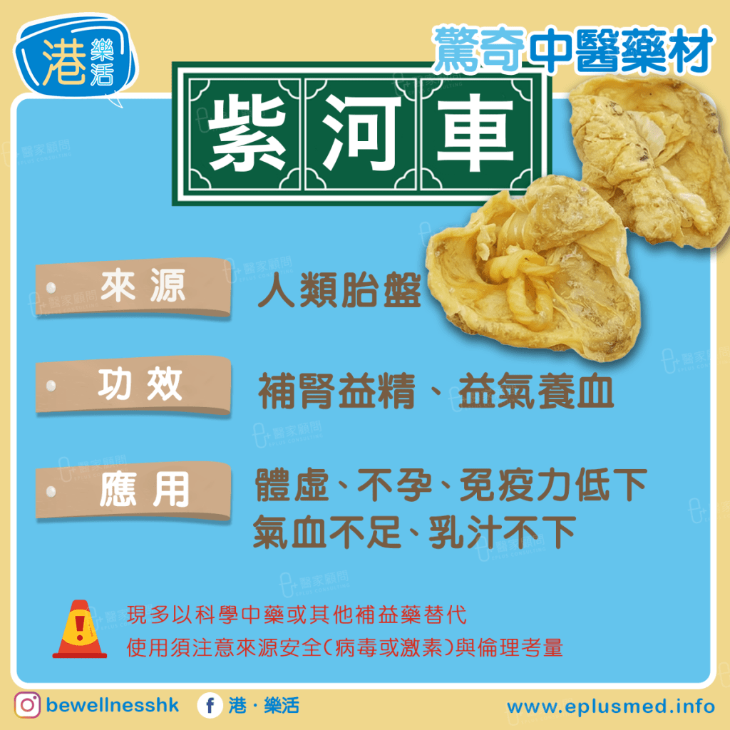 紫河車即人類胎盤,剛娩出時為紅色,稍為放置後轉紫色,因此稱為「紫河車」。紫河車是中醫傳統藥材,經過反覆清洗、乾燥、炮製後入藥,或研磨成粉用藥。