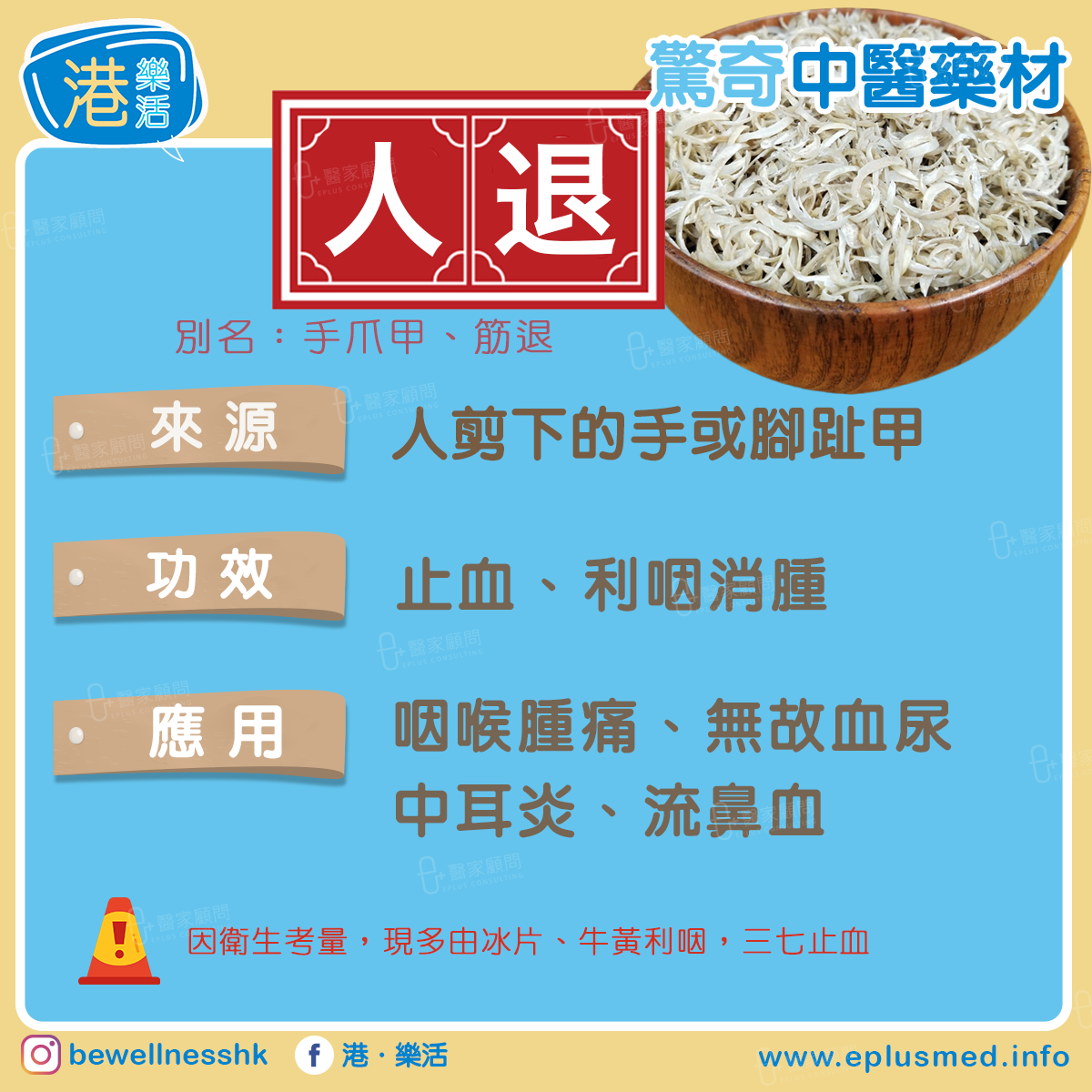 ❌人退在古代中醫屬「以形治形」的應用。因來源的衛生問題,現代臨床幾乎不用,多以其他藥物替代(如冰片、牛黃利咽,三七止血)。