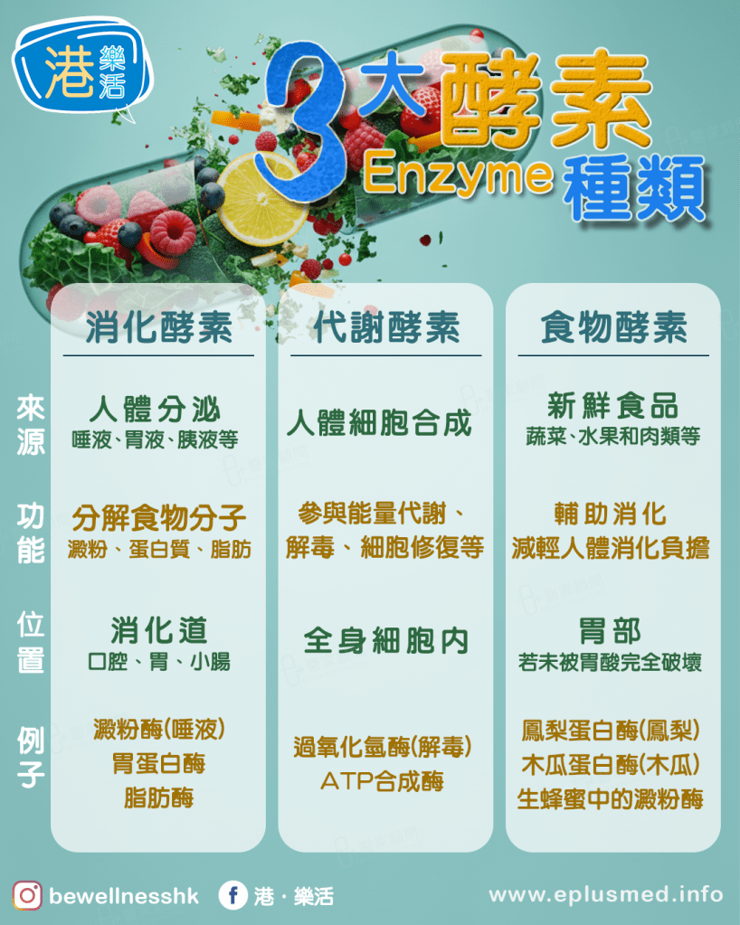 | 功能 | 分解食物大分子(澱粉、蛋白質、脂肪) | 參與能量代謝、解毒、細胞修復等 | 輔助消化,減輕人體消化負擔 |