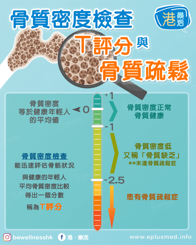 此分數以標準差(Standard Deviation, SD)表示,數值愈低,代表骨質密度愈差,骨折風險亦愈高。醫生會根據 T 評分及其他臨床因素判斷骨質狀況,並制定相應的治療及預防策略。