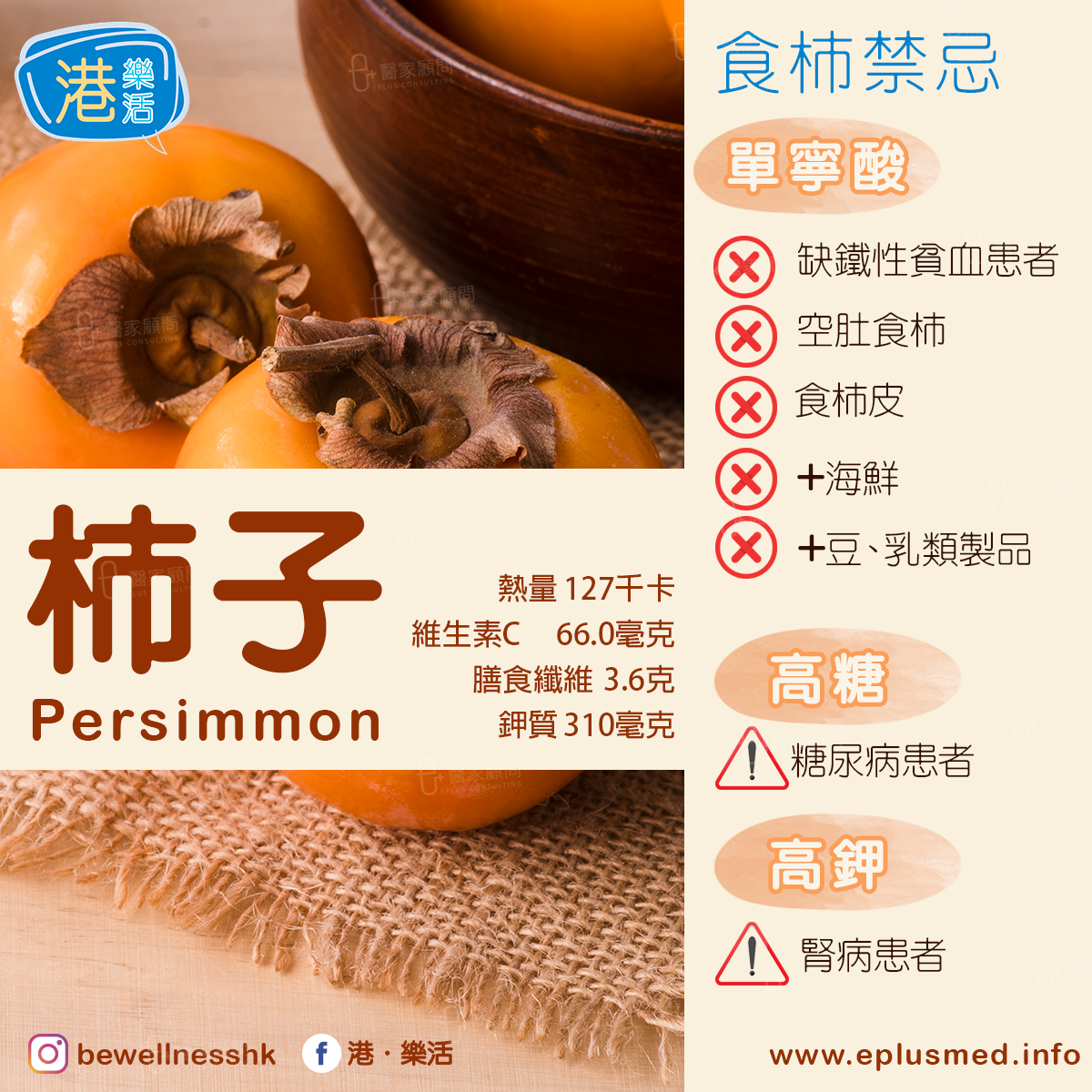 柿子的鉀含量高,有助體內多餘的鈉排出體外,達致鉀鈉平衡,預防水腫和高血壓。但注意有患腎病的人切勿食用過量,以免加劇病情。