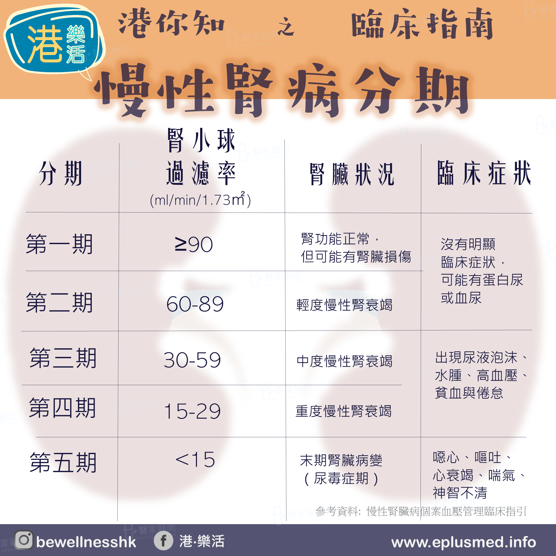 | 分期 | 分三期 (根據臨床病程分期) | 分五期 (根據eGFR分期) |