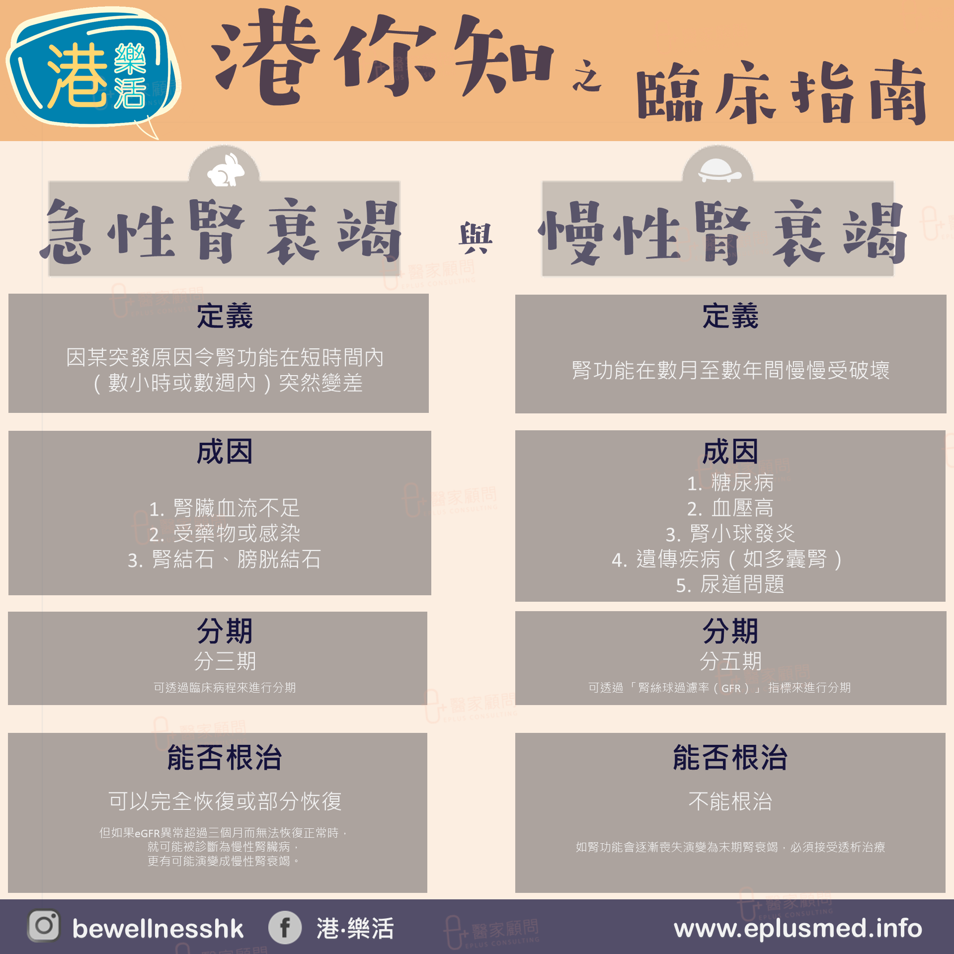 | 定義 | 因某突發原因令腎功能在 短時間內(數小時或數週內)突然變差 | 腎功能在數月至數年間慢慢受破壞 |