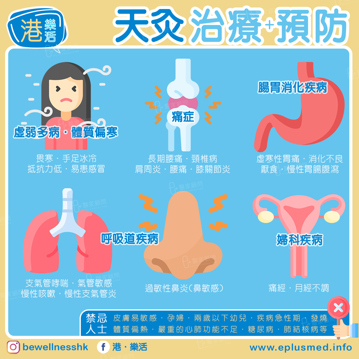香港人工時長、工作壓力大,不時都有消化不良、腰頸背痛、傷風感冒、鼻敏感等小毛病。在中醫保健療法中,中醫認為「天灸」有助治療呼吸道及腸胃消化系統等疾病。天灸療法是中醫針灸學中「灸法」的其中一種,又稱藥物灸。