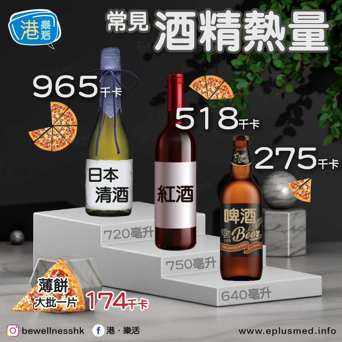 紅酒(750毫升) = 518千卡卡路里 = 3片大批薄餅;
