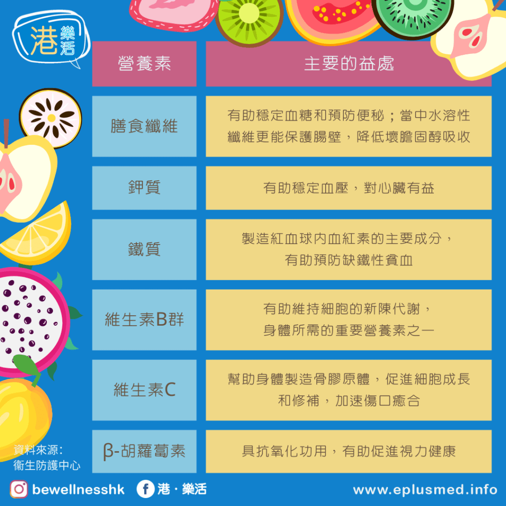 水果含豐富的膳食纖維、多種礦物質(如維生素A及C) 、葉酸及鉀質等重要的營養素,對保持人體健康很重要。