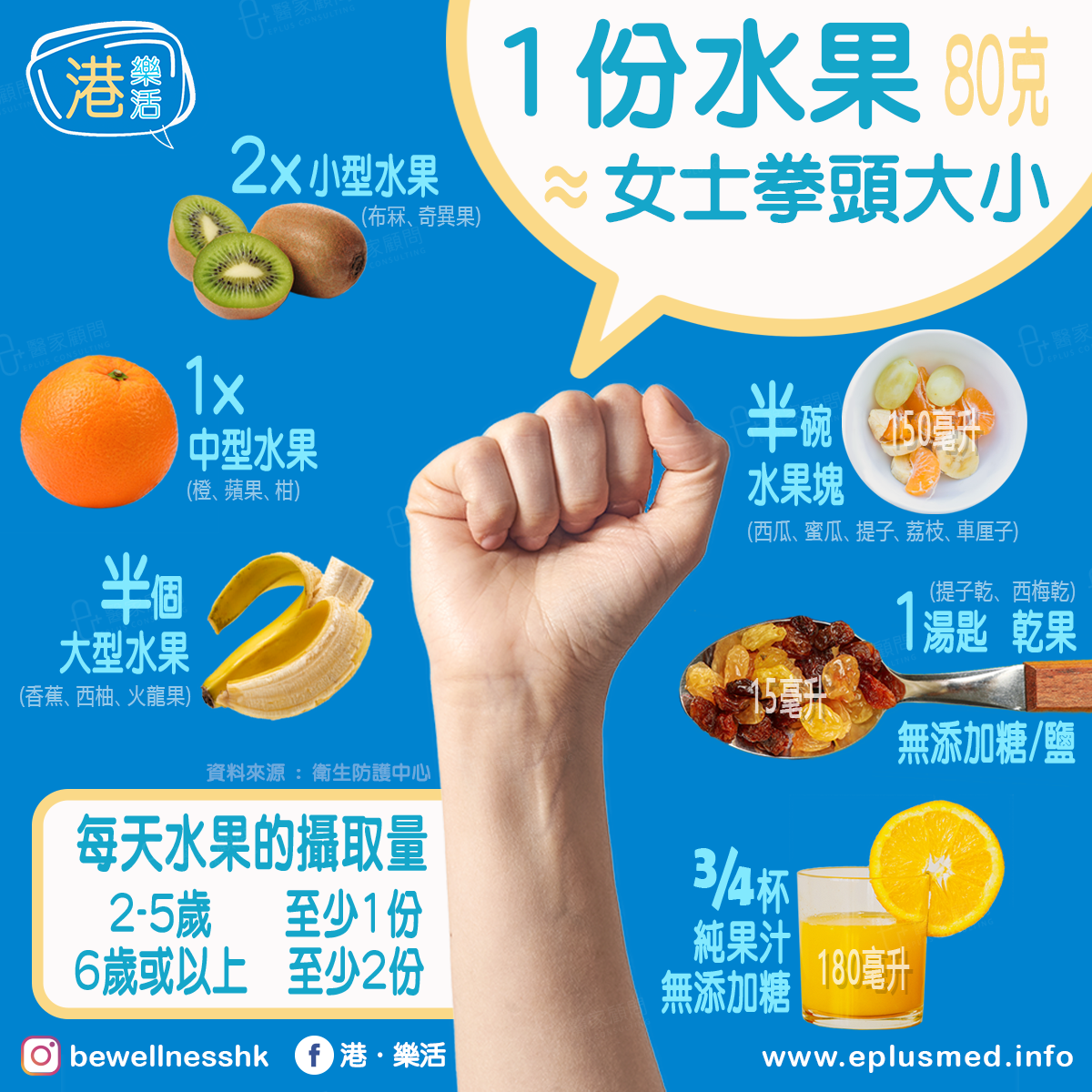 根據「健康飲食金字塔」的建議,2 – 5歲兒童每天應進食最少一份水果;6歲或以上兒童、青少年、成年人和長者則應每天進食最少兩份水果。