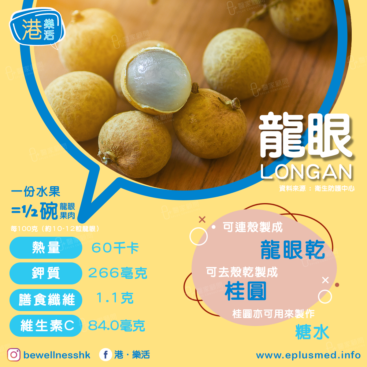 一份水果= ½碗龍眼果肉 (每100克 = 約10-12粒龍眼)