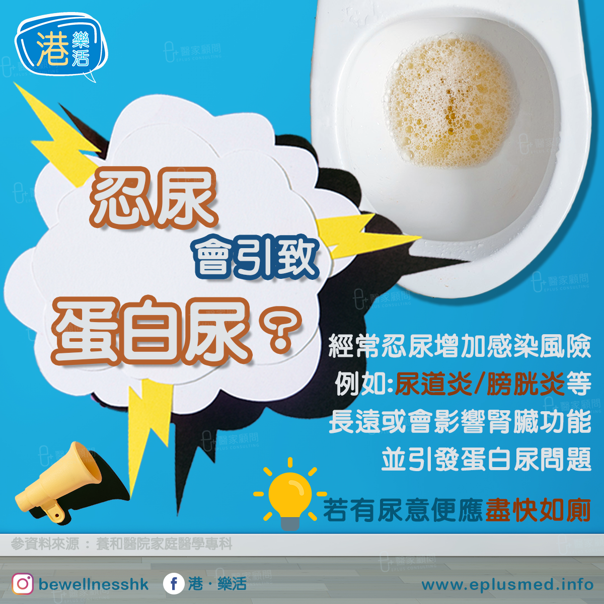 忍尿可能誘發尿道感染,有機會引致尿道炎或膀胱炎等,長遠或會影響腎臟功能,從而可能引致蛋白尿問題,因此若有尿意便應盡快如廁,不要長時間忍尿。