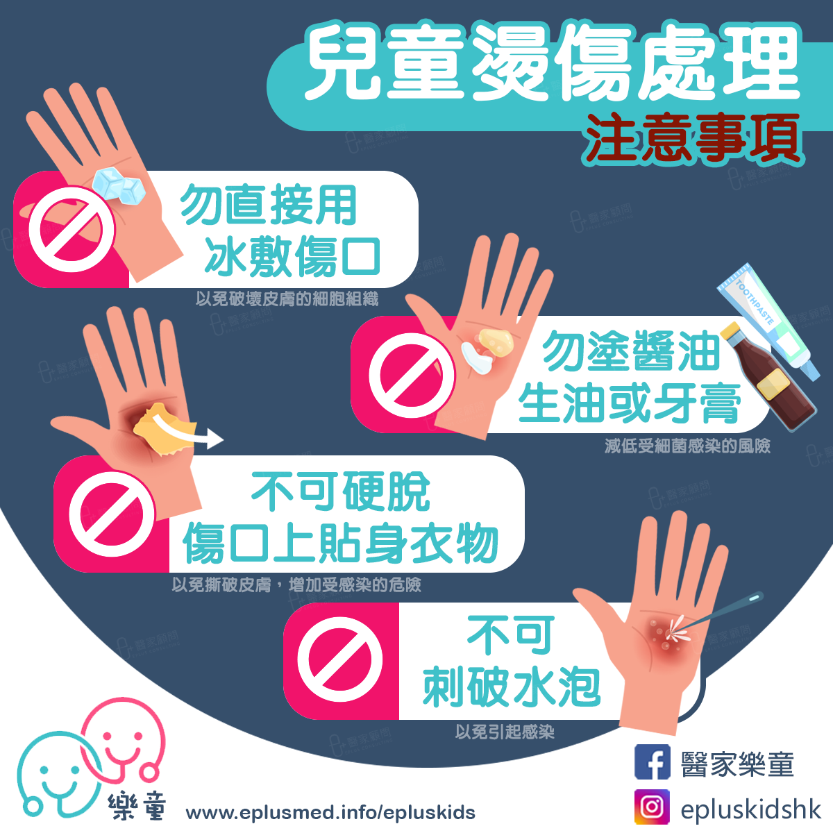 🚫 切勿在傷口上塗上任何醬油、藥油、凡士林、牙膏、化妝品或食油等,以免細菌帶入傷口,引起嚴重炎症。