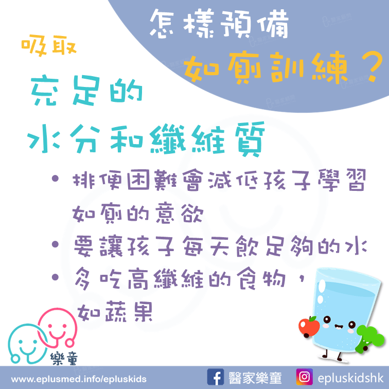 讓孩子每天吸取充足的水分和纖維質,使排泄通暢排便困難會減低孩子學習如廁的意欲,而足夠的水分亦可確保孩子常常有練習如廁的機會。