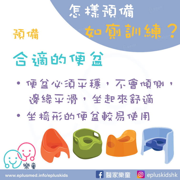 為孩子預備合適的便盆便盆的底部必須平穩,不會傾側,邊緣平滑,坐起來舒適。坐椅形的便盆對孩子來說較易使用。男孩子用的便盆,前端最好有防濺瀉的圍擋。若家長選用坐廁,需要加上兒童廁板及腳踏,讓孩子坐得安穩。