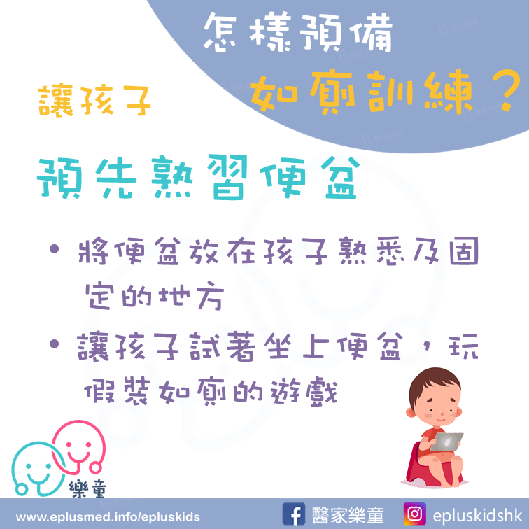 先讓孩子熟習便盆將便盆放在孩子熟悉及固定的地方,然後讓孩子多熟習便盆,可讓孩子穿著尿片/褲子的情況下試著坐上便盆,玩假裝的遊戲來練習如廁程序。家長可多跟孩子講關於上廁所的故事,或玩娃娃上廁所的遊戲等。