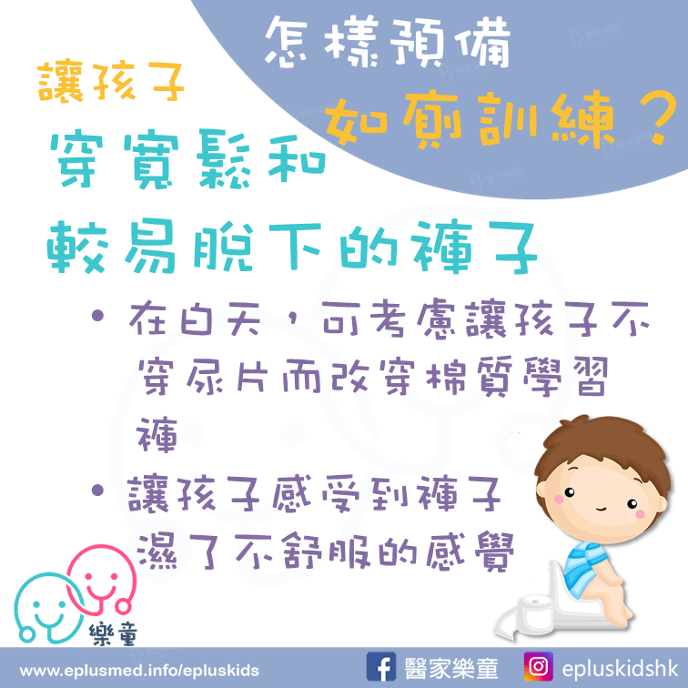 讓孩子穿寬鬆和較易脫下的褲子在日間可考慮讓孩子不包尿片,而改穿棉質學習褲,讓他感受到褲子濕了後不舒服的感覺。