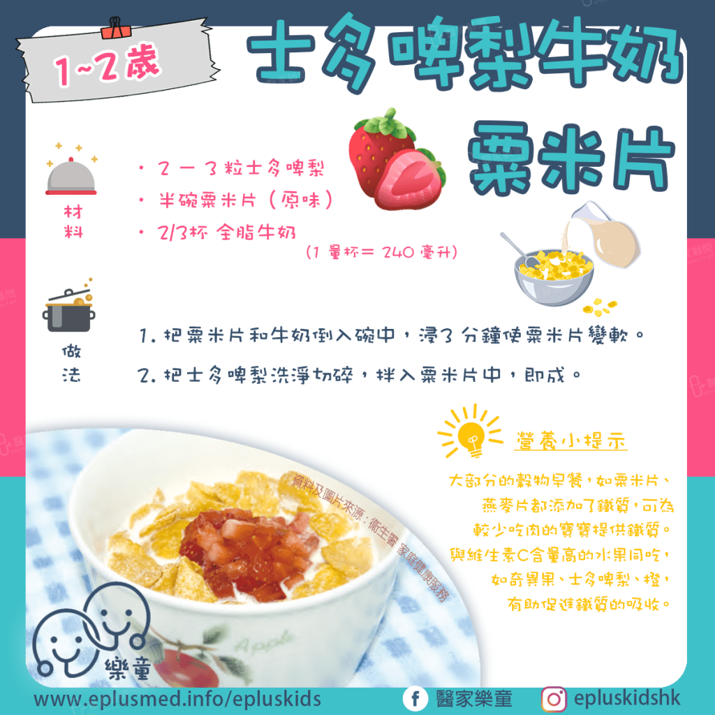 大部分的穀物早餐,如粟米片、燕麥片都添加了鐵質,可為較少吃肉的寶寶提供鐵質。與維生素C含量高的水果同吃,如奇異果、士多啤梨、橙,有助促進鐵質的吸收。